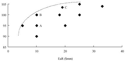 На диаграмме 3.4 представлены различные планируемые доходы и EaR, связанные с несколькими различными стратегиями хеджирования при разных воздействиях риска компании. Мы рассматриваем три стратегии A, B и C, представляемые точками A, B, и C на диаграмме. Предположим, что стратегия хеджирования А имеет планируемые доходы и EaR (обозначенный т. А на диаграмме), которые получились бы, если бы компания следовала планируемым нормам хеджирования, которые были произвольно выбраны, но интуитивно аргументированны (например, застраховать 50 % годовых товарных остатков, иностранной валюты, и открытых процентных позиций). Может, однако, иметься иная стратегия B, сочетающая различные нормы хеджирования, которые могли бы привести к планируемым доходам и EaR, показанным в точке B на диаграмме. Поскольку B имеет более высокий уровень планируемых доходов, чем А, для того же самого уровня EaR, это - более эффективная стратегия. Третья стратегия, C, может иметь более высокие планируемые доходы чем B, но и более высокий EaR. Стратегия С, следовательно, не обязательно более эффективна, чем B, но представляет вариант стратегии выбора между результатами и риском.