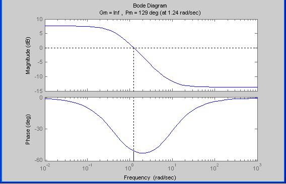 Необходимо составить zpk-модель системы и найти ее коэффициент передачи ( dcgain( ) ). Пусть W(s) = 0.7*(s+10) /[s*(s^2 + 5*s +16)]. Ее коэффициент передачи dcgain( s*W(s)) = 7 / 16. Это характеризует начальный участок ЛАЧХс наклоном –20 дб на декаду (интегрирующее звено).