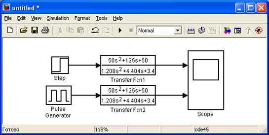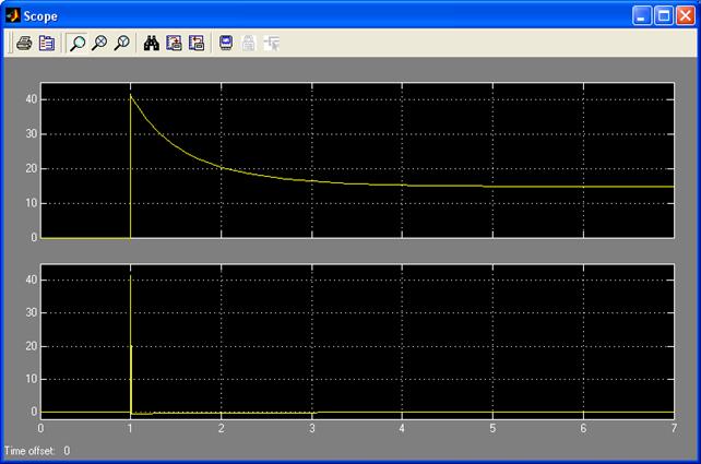 . Для построения воспользуемся передаточной функцией замкнутой системы (2). На вход 1-го звена подадим входное ступенчатое воздействие с задержкой 1 с, на вход второго – импульсное воздействие с параметрами (Period – 10 sec; Pulse Width – 1 %).