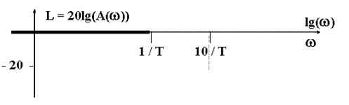 Асимптотическая ЛАЧХ апериодического звена начинается с горизонтальной прямой и сопрягается с прямой, имеющей наклон –20 дБ на декаду. Сопряжение производится на частоте, равной 1/T, где T – постоянная времени апериодического звена.