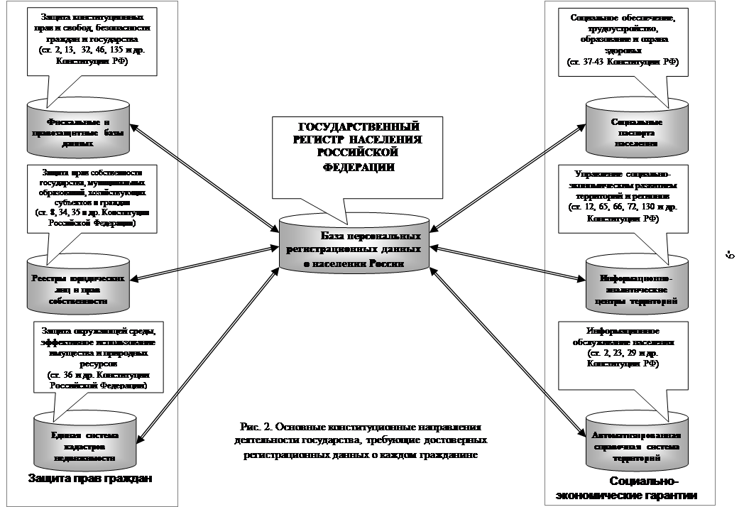 В настоящее время информационное взаимодействие между органами исполнительной власти отсутствует либо осуществляется по принципу «каждый с каждым» в интересах решения функциональных задач каждого отдельного органа и на основе готовящихся постановлений Правительства Российской Федерации. Необходимо на основе анализа потребностей в информационном обмене федеральных органов исполнительной власти, органов исполнительной власти субъектов Российской Федерации, органов местного самоуправления определить перечень общих для всех систем признаков личности и создать соответствующую этому перечню территориально-распределенную базу персональных данных о населении (государственный регистр населения), не ущемляя интересов ни одного из равноправных органов государственной власти и органов местного самоуправления.