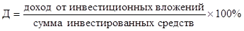 Рентабельность финансовых вложений вычисляется соотношением доходов, полученных по ценным бумагам и от долевого участия в уставных фондах других предприятий к стоимости финансовых вложений.