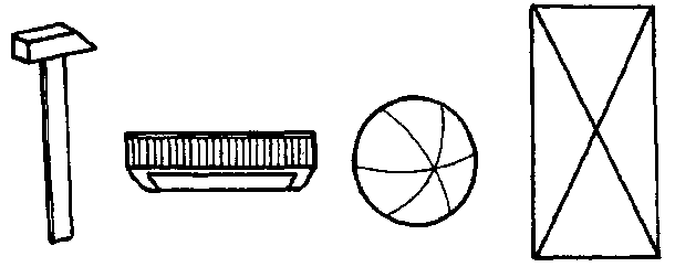 Можно предложить следующие предметные картинки: тарелка, арбуз, мяч, шарик; яйцо, дыня, огурец; крыша дома, лист треугольной формы, дорожный знак; платок, скатерть, шахматная доска; кузов машины, картина, книга.