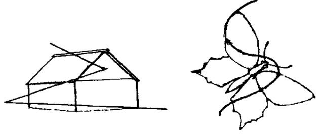 23. Дополнение рисунка. Предлагается нарисовать домик, справа и сверху от домика — солнце, слева от домика — забор, справа внизу нарисовать озеро, справа от забора — цветы.