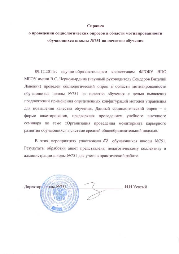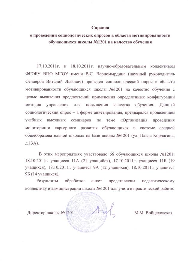 Подраздела 1 «Проведение мониторинга карьерного развития обучающихся и выпускников, социологических опросов в области мотивированности на качество обучения, анализ ситуации в образовательной среде на этой базе в системе средней общеобразовательной школы г.Москвы» сформирован обусловленный аналитический материал по 71 обучающему школы (Приложение 2. НИМ 6. Экспертная оценка достоверности и полезности аналитического обеспечения возникших ситуаций в образовательной среде на примере школы №1201), который был продемонстрирован рамках проведенного на базе школы №1201 19.10.2011 года Окружного учебного выездного семинара по теме «Организация работы Кабинета управления карьерным развитием учащихся в системе среднего общего образования» (см. рисунок 4), где отметили высокую степень практической значимости представленных материалов.