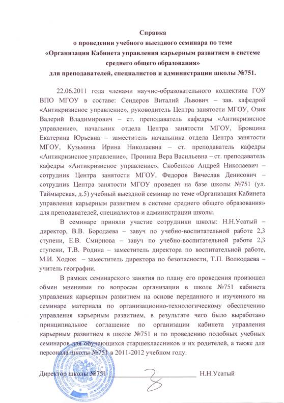 Организация окружного семинара «Развитие систем управления карьерным развитием молодежи» в форме научно-практической конференции, выездных учебных семинаров по организации проведения мониторинга карьерного развития обучающихся в системе средней общеобразовательной школы г.Москвы.» были проведены 2-а семинара: семинар в школе №751 22.06.2011 года, в котором приняло участие 5 сотрудников школы № 751,