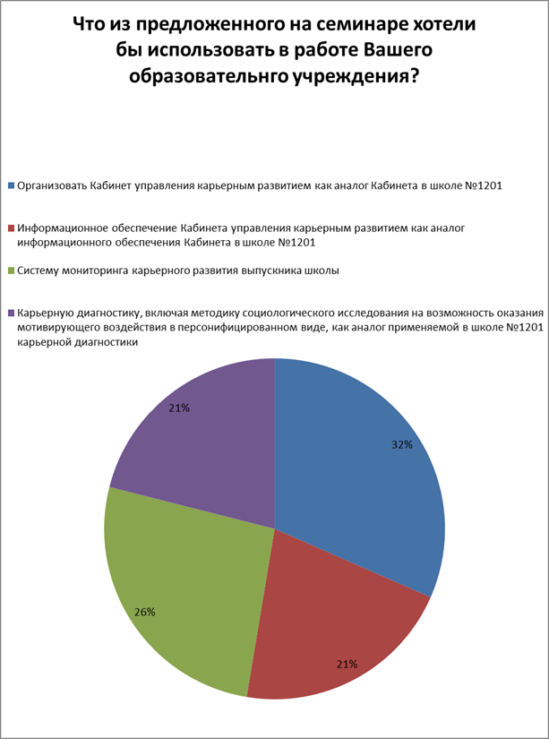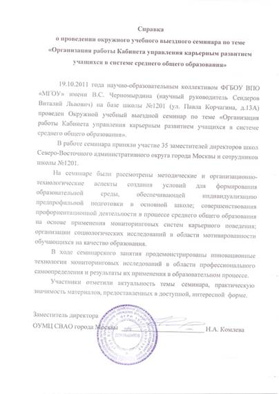Также результаты мониторинга карьерного поведения обучающихся школы №1201 были представлены 19.10.2011г. на Окружном учебном выездном семинаре «Организация работы Кабинета управления карьерным развитием учащихся в системе среднего общего образования» на базе ГОУ СОШ №1201, в работе которого приняли участие 35 заместителей директоров школ СВАО города Москвы (