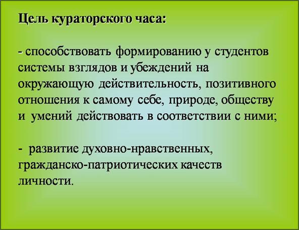 Кураторы являются частью системы учебно-воспитательной работы со студентами, поэтому все задачи этой работы одновременно являются и задачами кураторов. Как нам представляется, конечной целью вузовского образования является подготовка высококвалифицированного специалиста, отвечающего всем современным требованиям, патриота и гражданина своей страны, высоконравственного, культурного человека, обладающего широкой эрудицией. Существенный вклад в решение этой задачи могут внести кураторы, т.к. именно кураторская работа наиболее органично сочетает в себе процессы обучения и воспитания. Не секрет, что в девяностые годы во многих вузах учебно-воспитательная работа со студентами не была приоритетным направлением. В свете вышесказанного значение кураторской работы в настоящее время существенно возрастает.