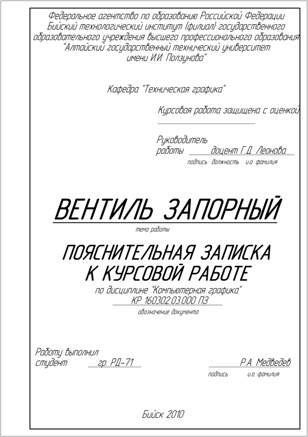 Курсовая работа по дисциплине «Компьютерная графика». Общие требования к созданию, организации выполнения и оформлению: методические рекомендации по организации самостоятельной работы студентов специальности 160302 «Ракетные двигатели» /Г.Д. Леонова, Л.В. Ильина; Алт. гос. техн. ун-т, БТИ. – Бийск: Изд-во Алт. гос. техн. ун-та, 2010. - с.
