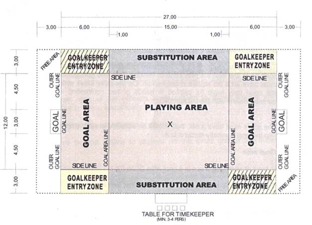 1.1 Игровая площадка (схема 1) представляет собой прямоугольник длиной 27м и шириной 12м, включающей игровую зону и две площади ворот.