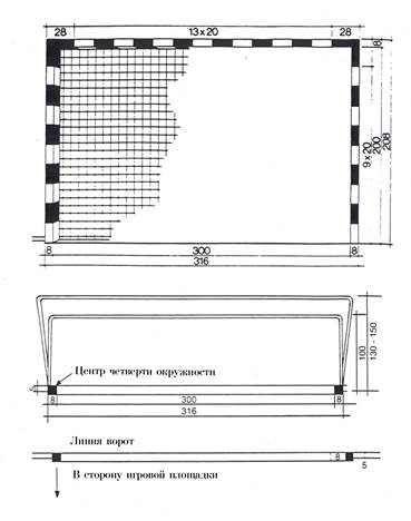 Стойки ворот скреплены горизонтальной штангой. Задняя кромка стоек ворот должна совпадать с внешней кромкой линии ворот. Стойки ворот и штанга имеют квадратное сечение со стороной 8см. Три поверхности ворот, которые можно видеть со стороны площадки, должны быть окрашены поперечными полосами в два контрастных цвета, четко отличающимися от цвета площадки.