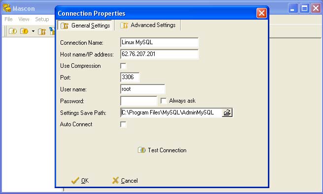 “Mascon” это программа, предназначенная для администрирования, в том числе удаленного, сервера MySQL. Программа работает в ОС Windows и не требует специальной инсталляции - достаточно скопировать папку AdminMySQL со всем содержимым на жесткий диск компьютера c ОС Windows и запустить файл ’masscon.exe’. Папка AdminMySQL находится на сервере кафедры АиС ‘//aisnt:/home/student/kurs5/PrIS/AdminMySQL’. После запуска программы откроется окно, вид которого показан на рис. 1.