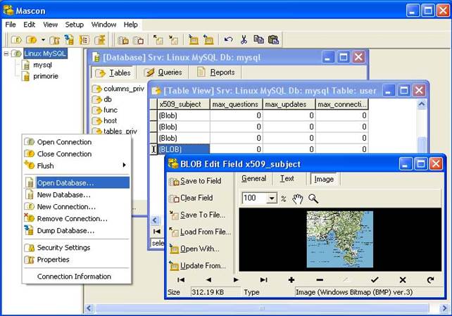 Программа “Mascon” позволяет создавать, удалять и редактировать базы данных, таблицы, содержимое таблиц. Для этого достаточно выбрать нужную функцию на левой панели программы (Рис. 4). Интерфейс программы достаточно прост и дальнейших пояснений не требует.