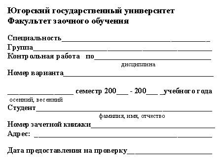 На титульном листе указываются: наименование учебного заведения (Югорский государственный университет); наименование факультета и номер специальности, по которой обучается студент; номер варианта и тема реферата; фамилия, имя и отчество студента; номер зачётной книжки; дата представления на проверку.
