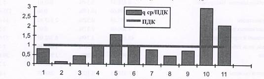 На рисунке 3 показаны средние концентрации примесей в атмосфере в целом по городам России, в единицах ПДК.
