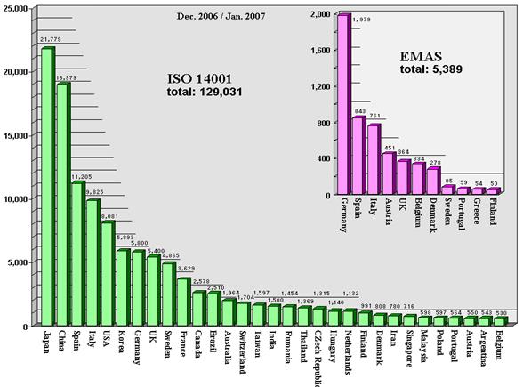 В Российских компаниях внедрение СЭМ идет очень медленно. Это объясняется тем, что преобладающее число предприятий работает во внутреннем секторе экономики, где партнерам не предъявляют обязательных требований по внедрению систем экологического менеджмента. В странах, «где относительная величина внешнеторгового оборота составляет 60-80% и более от величины валового внутреннего продукта», внедрение СЭМ идет более активно. Эта ситуация представлена на рисунке (рис. 5) [http://www.ecology.or.jp/isoworld/english/analy14k.htm].