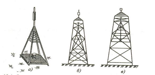 Рис.1. Конструкции наружных геодезических знаков: а) – тур или пирамида; б) – простой сигнал; в) – сложный сигнал