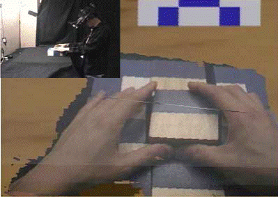 Во время поставленного эксперимента испытуемые выкладывали с помощью кубиков заданные узоры в одной из трех сред: реальной (действия совершались над настоящими кубиками, а испытуемый наблюдал рабочее поле через камеру и экран телевизора), виртуальной (с виртуальными кубиками, используя шлем виртуальной реальности и манипуляторы-«перчатки») и гибридной (действия совершались над реальными кубиками, но изображение с видеокамеры обрабатывалось и совмещалось с изображением виртуальных кубиков и рук) (рис. 3). Кроме этого в эксперимент были включены два разных варианта изображения виртуальных рук и кубиков, один из которых предлагал схематичный внешний вид, а другой использовал реальные изображения для создания внешнего вида, максимально приближенного к настоящему.