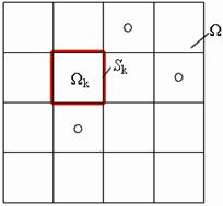 . Каждое предполагаемое место сосредоточения особенности (отверстие, неоднородность и т.п.) при этом должно быть заключено строго внутри одного СЭ. На рис. 2 показан пример равномерного разбиения области на квадратные СЭ с границей , , где – общее число подобластей-суперэлементов. Функции, разложением по которым разыскивается приближенное решение, для краткости будем называть базисными. Они являются финитными, их носители связаны с СЭ. При этом задание аппроксимаций в МКСЭ связано не со всей двумерной подобластью , а только с её одномерной границей.