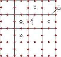 Все дальнейшие рассмотрения мы проведем на примере задачи Дирихле для уравнения Лапласа в двумерной области . Область представляет собой квадрат с исключенными из него кругами, радиус которых мал по сравнению с размерами Ω (рис. 1). Полагаем, что в окрестностях таких мелких отверстий сосредоточены все резкие “сингулярности” решения.