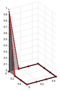 Ранее в [6; 9] предложены и исследованы различные варианты продолжения этих функций с узлов на ребра СЭ. Варианты заключаются в представлении базисных граничных функций на каждом из ребер границы некоторым “стандартным” интерполянтом [19]: полиномиальным, кусочно-линейным, сплайном и т.д. Одна из таких функций при кусочно-линейной зависимости представлена на рис. 4, а при полиномиальной зависимости второго порядка на ребрах границы СЭ – на рис. 5.