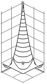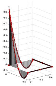 в СЭ . Базисные функции единообразно задаются в каждом из СЭ , , области расчета . Пример базисной функции показан на рис. 6. Он соответствует граничной базисной функции , заданной полиномом второго порядка (рис. 5). Представляет интерес дальнейшее рассмотрение вариантов МКСЭ при полиномиальной или сплайновой интерполяции.