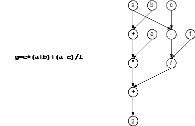 Пронумеруем последовательно все узлы ярусно-параллельной формы приведенной на рисунке 1.1(б) каким-либо образом, например, слева направо и сверху вниз. Идентификаторы переменных, если их значения используются другими операциями, будем рассматривать как операции чтения данных переменных. Если идентификатор фиксирует результат выполнения операции, то его будем рассматривать как операцию записи данной переменой. Запишем выполняемые операции в порядке номеров. В качестве операндов выполняемой операции укажем номера операций, результаты исполнения которых являются ее аргументами.