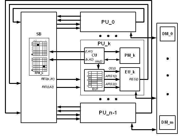 Рассмотрим параллельную систему показанную на рисунке 2.1 и состоящую из N процессорных блоков PU_0, PU_1, …, PU_n-1 связанных между собой однонаправленным коммутатором(SB) типа «каждый с каждым», имеющим N информационных входов и 2N информационных выходов, а также 2N адресных входов.
