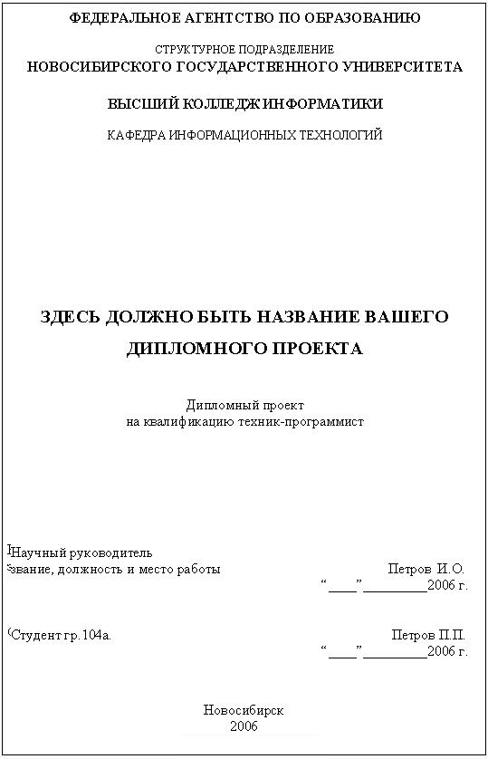 Студенту следует обратить особое внимание на то, что тема дипломного проекта должна быть сформулирована совершенно одинаково во всех документах, где она упоминается, а именно: приказ по ВКИ, бланк задания на дипломирование, титульный лист, отзыв руководителя, рецензия.