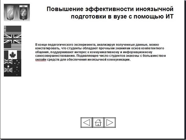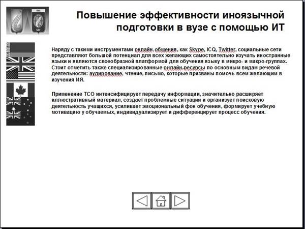 Сегодня все больше и больше преподавателей иностранного языка стараются применять ИКТ на занятиях. Новейшие компьютерные программы позволяют не только проверять усвоение учащимися языковых понятий, но и могут служить языковыми тренерами и в какой-то степени заменить преподавателя, предоставляя учащимся возможность самим ставить цели и задачи каждого конкретного занятия. Что же касается глобальной сети Интернет, то следует отметить, что использование ресурсов всемирной сети позволяет повысить мотивацию обучаемых, дает возможность использовать иностранный язык для общения со сверстниками и вообще снимает границы языковой коммуникации. Электронная почта, форумы, конференции, чаты, интернет-пейджеры (ICQ, MSN), IP-телефония (Skype), социальные сети (Facebook, LiveMocha) ввиду своего специального назначения позволяют изучающим иностранный язык самим находить языковых партнеров, носителей языка в киберпространстве. И все же не стоит забывать, что современные требования к обучающимся не сводятся лишь к способности общения на иностранном языке и информационной грамотности. Информационно-коммуникативные технологии должны оставаться лишь средством обучения иностранному языку и не превращаться в цели и задачи на занятиях.