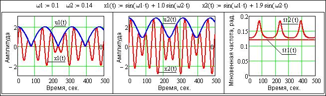 Что касается мгновенных значений частоты, то при равной амплитуде гармоник мгновенная частота во всех точках сигнала равна среднему значению частот гармоник. При неравной амплитуде гармоник функция мгновенной частоты сдвигается в сторону частоты гармоники с большей амплитудой и приобретает пульсирующий характер, при этом пики экстремумов частотных пульсаций соответствуют минимумам огибающих пульсаций и также направлены в сторону частоты гармоники с большей амплитудой.