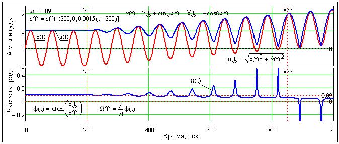 Отсюда, огибающая u(t) и мгновенная фаза w(t) сигнала x(t):