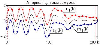 - основной шаг в генерации модовых функций, как базиса для спектрального анализа Гильберта. Обычно используются кубические сплайны, но при их применении могут возникать серьезные проблемы на концевых участках сигналов, где у кубического сплайна могут быть большие колебания. На качество выделения модовых функций влияет также четкость выделения всех экстремумов, которая зависит от частоты дискретизации данных. Для повышения качества процесса EMD и частотной разрешающей способности анализа можно использовать сплайны более высокого порядка, но это связано с увеличением трудоемкости вычислений.
