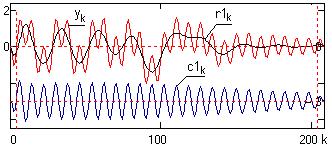Ортогональность базиса может быть проверена скалярным произведением любых пар компонентов IMF. Сумма (24.2.6) всех компонентов IMF, включая остаток, должна реконструировать входной сигнал и может использоваться для определения ошибки декомпозиции. Как правило, наибольшие локальные ошибки декомпозиции наблюдаются на концевых участках входного массива данных. Для исключения ошибок рекомендуется задавать интервалы начальных и конечных условий, а сигнал на этих интервалах формировать какой-либо функцией прогнозирования, или продлевать (четно или нечетно) функцией самого сигнала.
