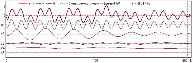 3. Так как суммирование всех функций IMF (реконструкция сигнала) должно давать исходный сигнал, то можно останавливать разложение заданием относительной погрешности среднеквадратической реконструкции (без учета остатка rn
