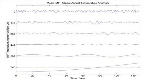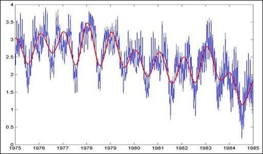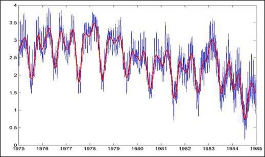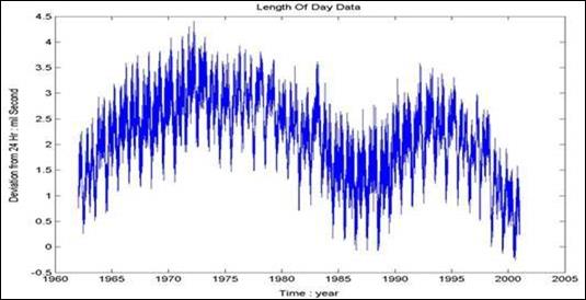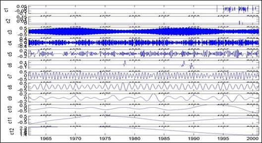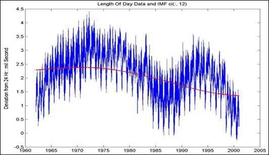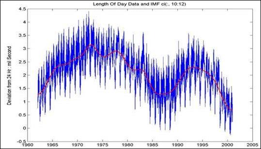 В качестве примера в работе /3/ приводится EMD-анализ данных девиации периода вращения Земли. В результате исследований всем выделенным функциям IMF сопоставлены определенные физические процессы, которыми и вызвано их формирование (влияние штормов и тайфунов, месячных вариаций мощности приливов, явления Эль-Ниньо и прочие факторы). Ниже, без комментариев, приводятся выборки из результатов данного анализа, демонстрирующие свойства базиса.