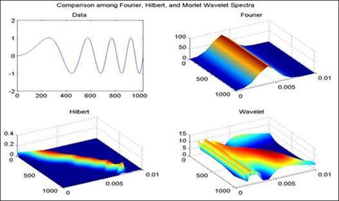 функционального базиса преобразования. Функции базиса получаются адаптивно непосредственно из данных процедурами отсеивания функций «эмпирических мод». Мгновенные частоты вычисляются от производных фазовых функций Гильбертовым преобразованием функций базиса. Заключительный результат представляется в частотно-временном пространстве /1/.