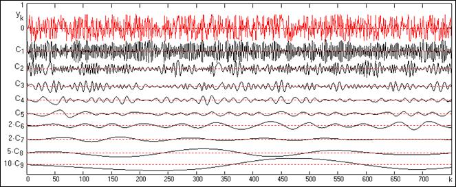 На рис. 24.2.7 приведен пример полной декомпозиции сигнала с остановом по критерию 1. На верхнем графике рисунка приведен входной сигнал преобразования (красным) и сигнал обратной реконструкции (пунктиром) суммированием функций разложения ci