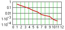 На рис. 24.4.2 приведен результат EMD модели y(k) шума на первых 750 отсчетах. Шумовой сигнал данной реализации был разложен на 12 функций IMF, первые девять из которых приведены на рисунке (4 последних функции в увеличенном масштабе). Останов процесса декомпозиции выполнен по минимуму погрешности реконструкции без учета остатка, процесс снижения погрешности при увеличении количества функций IMF приведен на рис. 24.4.3. Количество функций IMF в различных реализациях случайного сигнала изменяется от 8 до 14. Останов итераций при вычислении каждой функции IMF был установлен по относительному расхождению между последовательными итерациями с порогом 0.01%, при этом количество итераций для первых функций IMF достигает 30 и, как правило, постепенно снижается. Погрешность реконструкции с учетом остатка практически равна нулю. Вычислением скалярного произведения любых двух функций IMF можно убедиться в их взаимной ортогональности.