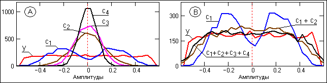 На рис. 24.4.4-А приведены гистограммы первых четырех IMF в сопоставлении с гистограммой входного сигнала y(k)