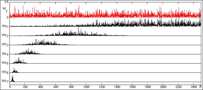 По рис. 24.4.5 видно, что процесс EMD обладает вполне определенной частотной избирательностью на каждом уровне EMD. Но говорить о каких-либо частотных передаточных функциях EMD, по-видимому, будет некорректным, так как любая частотная составляющая wi