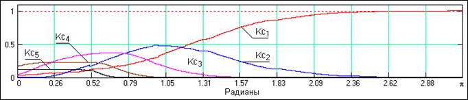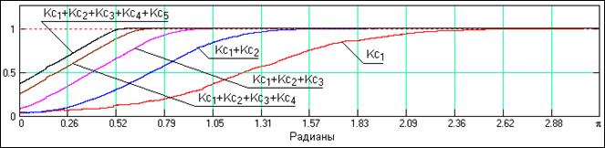 На рис. 24.4.7 приведены графики последовательного суммирования коэффициентов «эквивалентных» передаточных функций, которые показывают процесс последовательного перекрытия всего частотного диапазона входного сигнала.