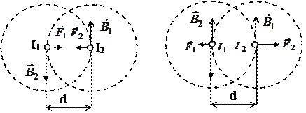 , направление силы взаимодействия меняется на противоположное при изменении направления силы тока в одном из контуров.