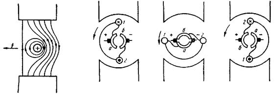 Коллектор предназначен для изменения направления тока в проводах обмотки, при переходе проводников через геометрическую нейтраль (рис. 2). Покажем это на примере витка 1—2, помещенного в магнитное поле. Из рисунка 2 видно, что в положении I виток будет вращаться против направления движения часовой стрелки. В положении II виток пройдет геометрическую нейтраль по инерции, в положении III направление тока в витке изменится на противоположное благодаря коллектору. Из сопоставления положений I и III видно, что виток будет продолжать вращаться в ту же сторону, так как электромагнитный момент, действующий на виток на протяжении полного оборота, направлен в одну сторону.