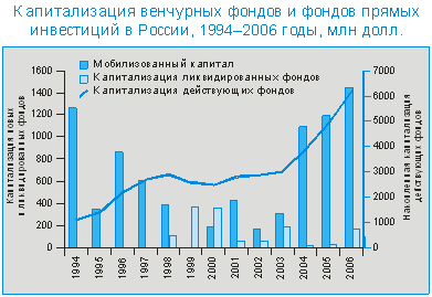 В России к концу 2006 года объем капитала под управлением, аккумулированный во всех фондах, действующих на российском рынке прямого и венчурного инвестирования, превысил 6 млрд. долл. - таким образом, прирост по отношению к предыдущему (2005) году составил порядка 25,6%. По оценкам экспертов, на конец 2007 года на российском рынке прямых и венчурных инвестиций было аккумулировано более 10 млрд. долл., из которых (очень приблизительно) на венчурный капитал «падает» не более 1 млрд долларов.