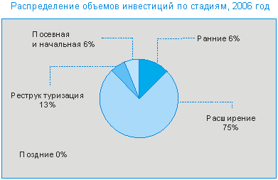 Общая сумма инвестиций в российские компании в 2006 году составила около 653 млн долл., что превышает объем инвестиций за 2005 год более чем в 2,5 раза. Инвестиционные приоритеты фондов фактически не изменились, и лидирующие позиции сохранились за секторами телекоммуникаций, потребительского рынка и финансов. При этом выросли в абсолютном выражении суммарные объемы сделок.