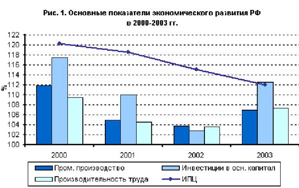 Как видно из рисунка, на протяжении 2000-2002 гг. темпы роста промышленного производства, инвестиций в основной капитал, а также производительности труда сокращались, однако в 2003 г. снова начали расти. В то же время наблюдалось снижение темпов роста цен в течение всего рассматриваемого периода. Основной причиной ускорения экономического развития считается высокий внешний спрос на товары российского экспорта в связи с благоприятной внешнеэкономической конъюнктурой. Так, согласно расчетам Минэкономразвития, из 7,5% роста ВВП в 2003 г. около 2 процентных пункта обусловлено превышением среднегодовой цены ($27,3 за баррель) на нефть марки “Urals” уровня в $18,5 за баррель. При этом основная часть – примерно 4,6 процентных пункта определяется внутренними факторами (рост инвестиций в основной капитал, доходов населения), оставшиеся 0,6 процентных пункта относятся к “эффекту базы 2002 г.”.