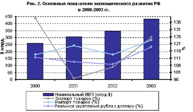 Представление номинального ВВП в долларовом выражении не совсем четко отражает складывающуюся ситуацию, прежде всего, благодаря волатильности курса американской валюты в последние годы, тем не менее, экономический подъем налицо. Благоприятная внешнеэкономическая конъюнктура последних лет стала причиной роста экспорта сначала в 2000 г., (почти на 40%), а затем после коррекции 2001 г.(-3%) в 2002 г. (на 5,3%) и 2003 г. (на 26,2%). Темпы роста импорта в период 2000-2002 гг. находились на уровне 13,5% – 20% в год, а в 2003 г. составили 27,3%. Увеличение импорта также связано с притоком иностранной валюты в Россию и последующего реального укрепления рубля. Относительно последнего хотелось бы отметить, что укрепление российской валюты относительно доллара США происходило на протяжении всего рассматриваемого периода, однако в 2003 г. наблюдались самые высокие темпы.