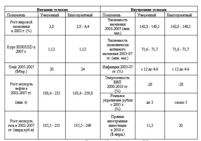 Итак, согласно докладу Минэкономразвития, в случае реализации умеренно-консервативного сценария развития, мировой экономический рост в 2003 г. составит 2,8%, обменный курс доллара к евро снизится к 2007 г. до 1,12, а цены на нефть в ближайшие три года будет колебаться около 20 долл./бар. Одновременно ежегодное реальное укрепление рубля не превысит 3%, иностранные инвестиции к 2010 г. достигнут $11,3 млрд., а энергоемкость ВВП России снизится на 26%.