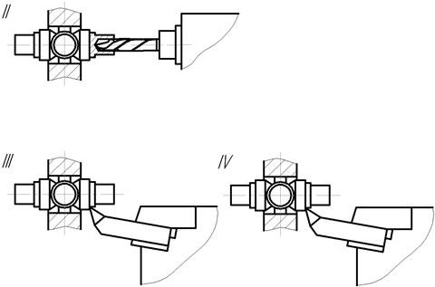 Рис.2. Обработка крестовины кардана по методу концентрации операций в позициях: II – сверление отверстия; III – токарная обработка предварительная; IV – токарная обработка окончательная